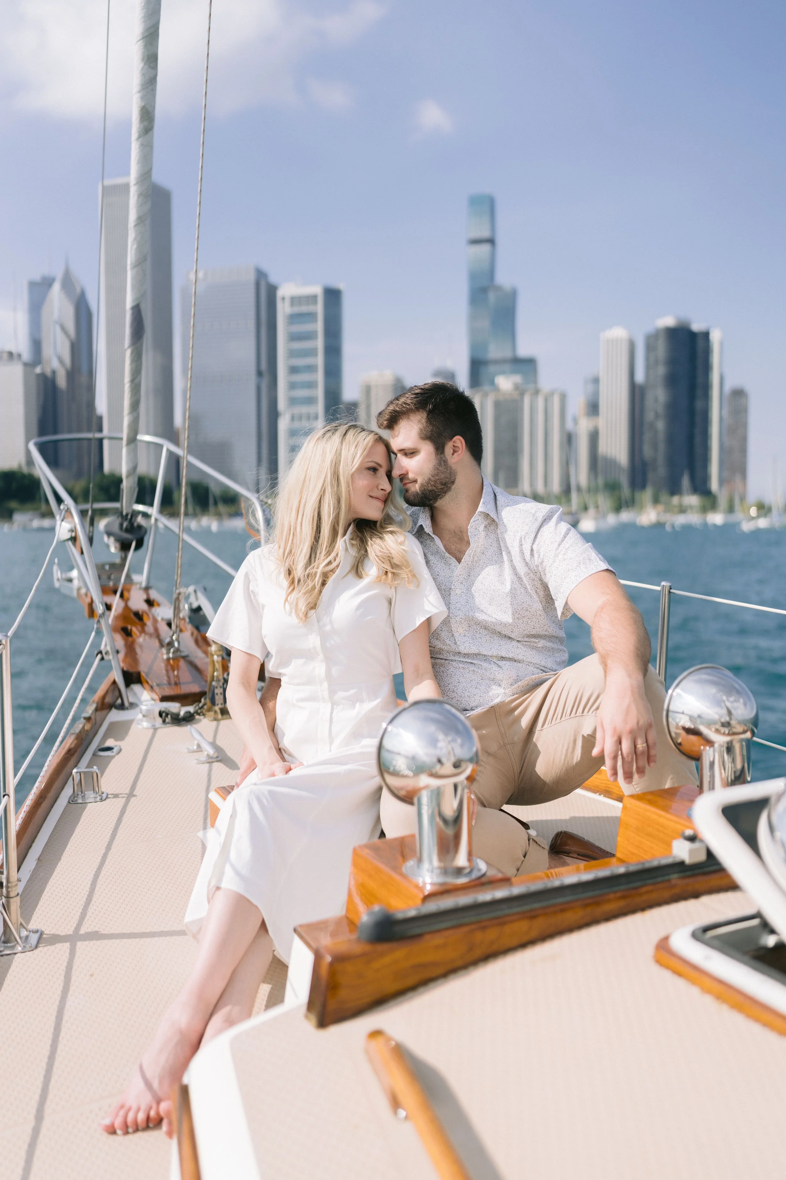 It was a warm summer day as Whitney and Hunter Mac stepped onto the deck of the sailboat. With a bottle of Veuve Clicquot in hand, they were ready to toast an afternoon on Lake Michigan. The captain showed them the most beautiful view of the Chicago skyline on their sail. There’s nothing quite like summer on the lake in Chicago. I’m so grateful I got to come along as they took in the last bits of summer in Chicago during their session.